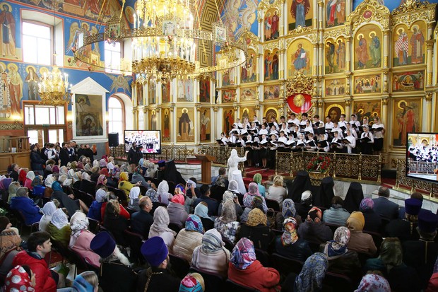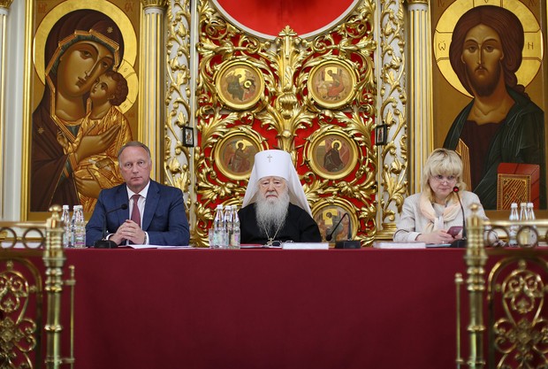 28 сентября в Богоявленском соборе Ногинска состоялась встреча Управляющего Московской епархией Русской Православной Церкви Митрополита Крутицкого и Коломенского Ювеналия с руководителями образовательных организаций Московской области. Тема встречи: «Задачи, опыт и дальнейшее развитие соработничества». В форуме приняли участие министр образования Московской области Марина Борисовна Захарова и представители министерства образования Московской области, викарии, благочинные и члены Отдела религиозного образования и катехизации Московской епархии, начальники управлений образования, руководители образовательных организаций, ректоры вузов, представители Ассоциации педагогов духовно-нравственной (православной) культуры – всего более 300 человек. Городской округ Фрязино представляли заместитель начальника Управления образования Чигарева Т.И., директор МОУ СОШ №4 Ильичева Е.А. и настоятель Державного храма города Фрязино священник Димитрий Поповский.