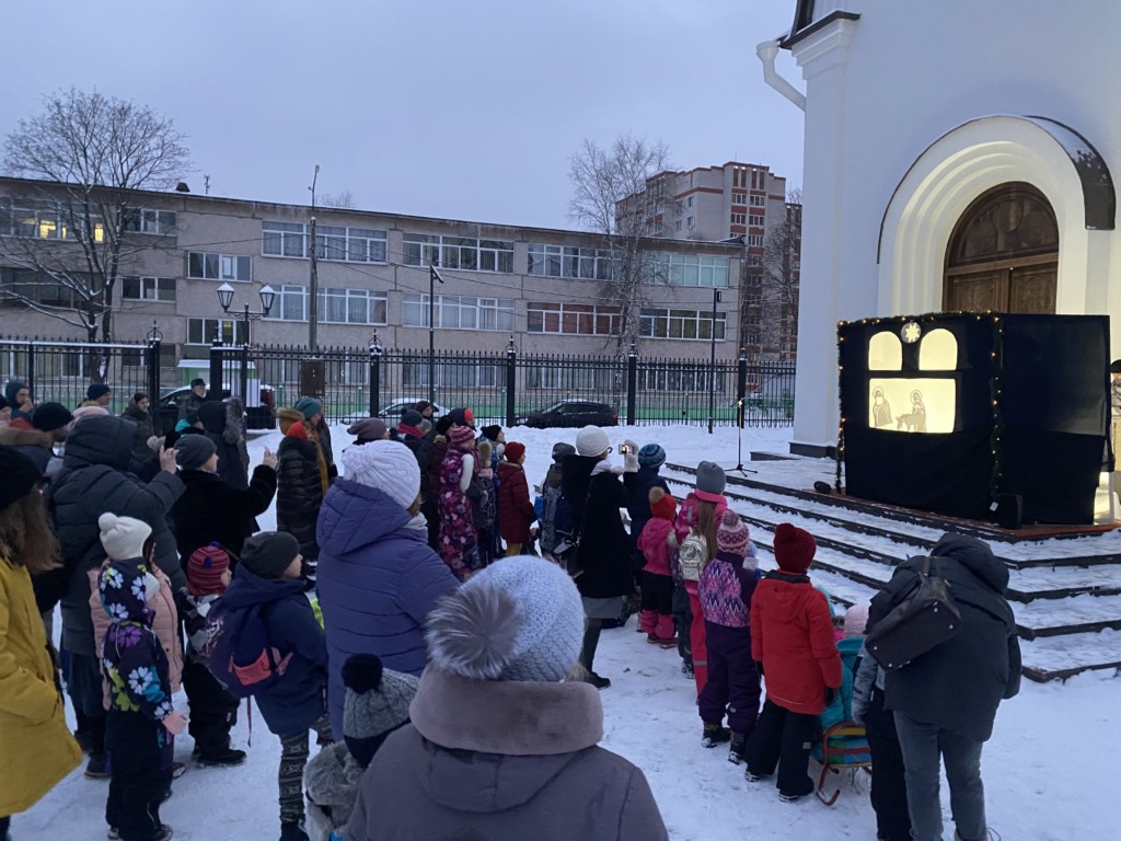 После общей фотографии все переместились на улицу. Во дворе храма прихожан ждали колядки, игры, хороводы и угощение. Кульминацией праздника стало традиционное представление теневого Рождественского вертепа.