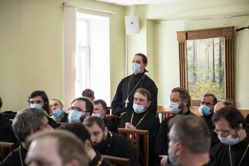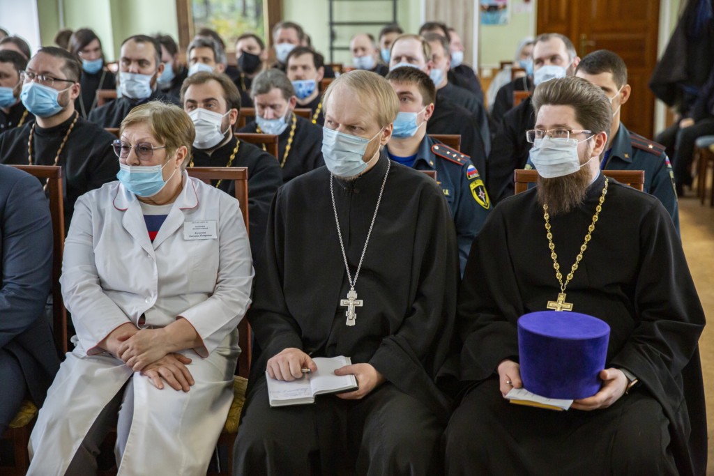 Далее Глава Андрей Булгаков обратился к собравшимся батюшкам с сообщением, в котором рассказал об основных направлениях взаимодействия администрации округа с благочинием, а также попросил призывать прихожан своих храмов не забывать о масках, перчатках и социальной дистанции, особенно в преддверии Праздника Пасхи, который соберет в храмах большое количество людей. А ещё лучше — обезопасить себя заранее и сделать прививку.