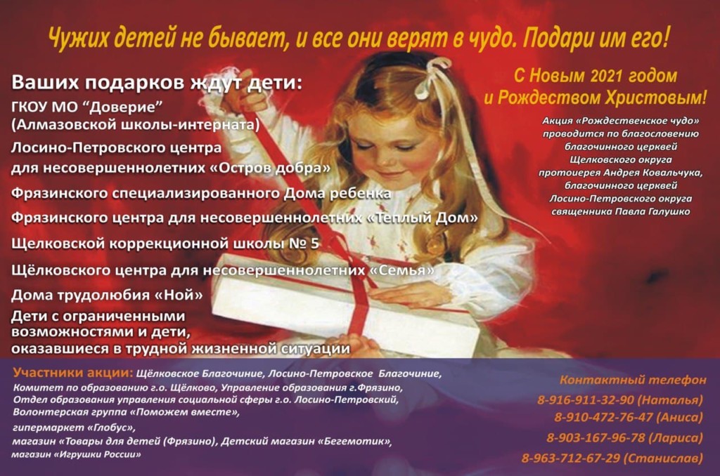 Уже стало доброй традицией наше участие в ежегодной благотворительной акции «Рождественское чудо». В течении декабря мы будем собирать подарки для детей. Акция проходит с 15 ноября по 31 декабря. Прочитайте внимательно информацию. Подарки собираются для детей-сирот, детей с ограниченными возможностями, детей в трудной жизненной ситуации. Для сбора подарков в притворе храма подготовлена коробка.