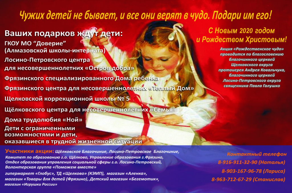 Стартовала десятая благотворительная акция «Рождественское чудо». Это акция по сбору подарков для детей, находящихся в детских домах, социальных центрах, для детей с ограниченными возможностями, детей, оказавшихся в трудной жизненной ситуации, проживающих на территории Щёлковского района, г. Фрязино и г.о. Лосино-Петровский. В десятый раз объединяются жители этих территориальных образований, чтобы всем вместе совершить свое маленькое «рождественское чудо». Благодаря этой акции более 800 детей получили подарки в прошлом году.