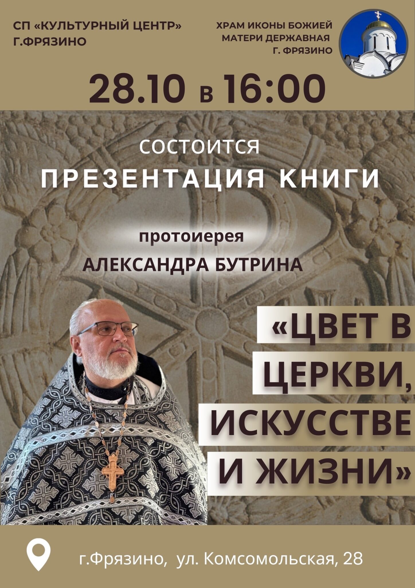 Приглашаем на презентацию новой книги клирика храма Божией Матери Державная г. Фрязино протоирея Александра Бутрина под названием: «Цвет в церкви, искусстве и жизни».