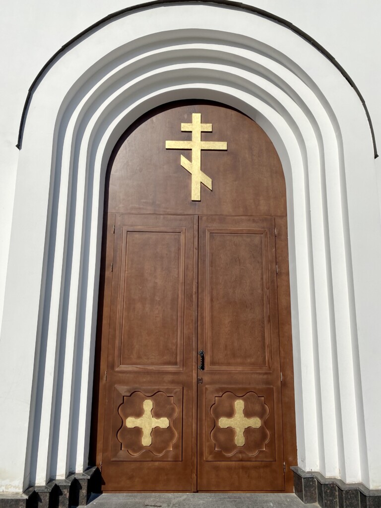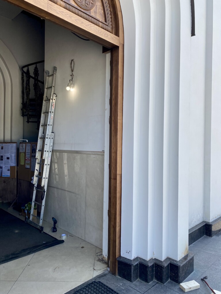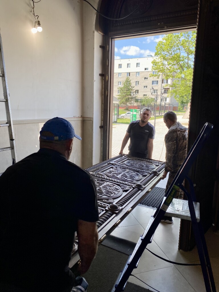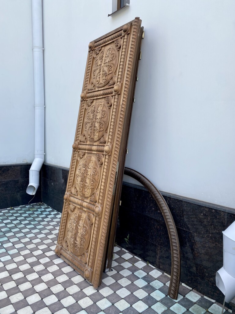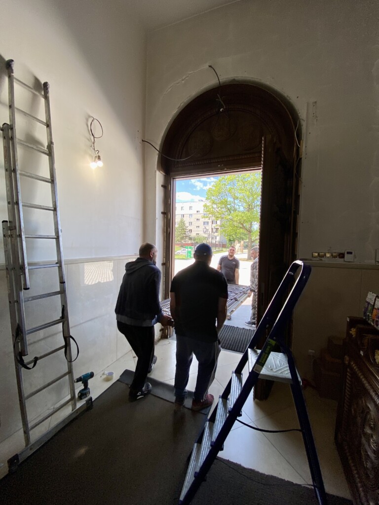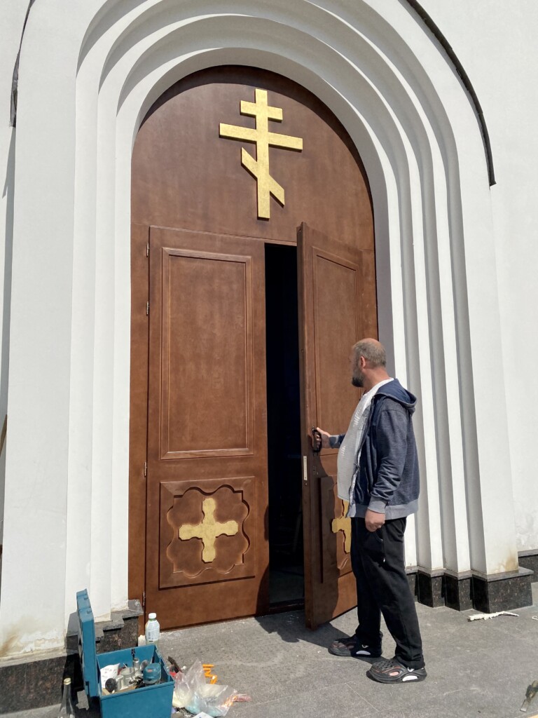 Демонтировали входную (западную) дверь храма вместе с дверной коробкой. Отвезли в мастерскую для реставрации и переделать её, чтобы дверь открывалась наружу.