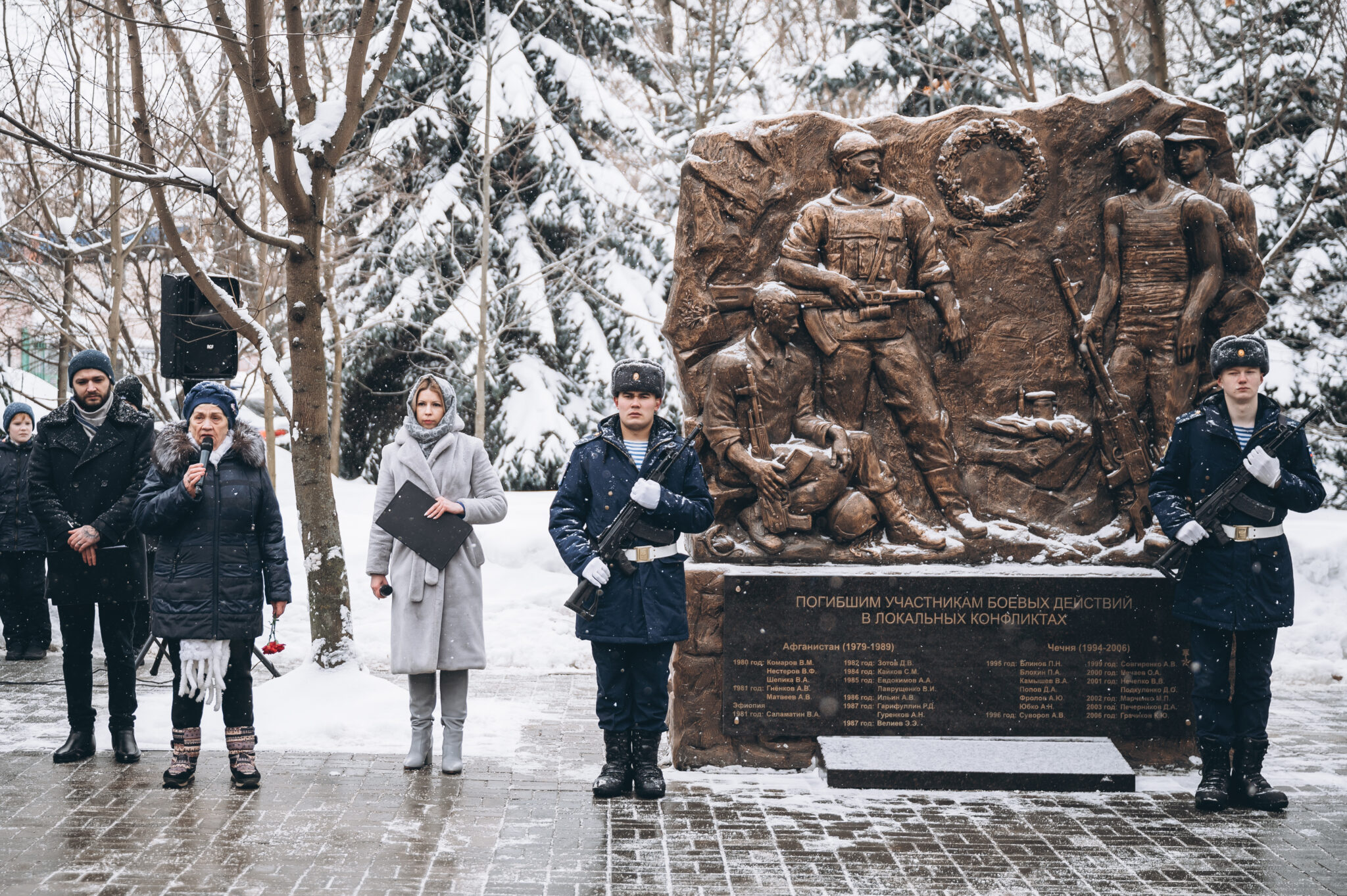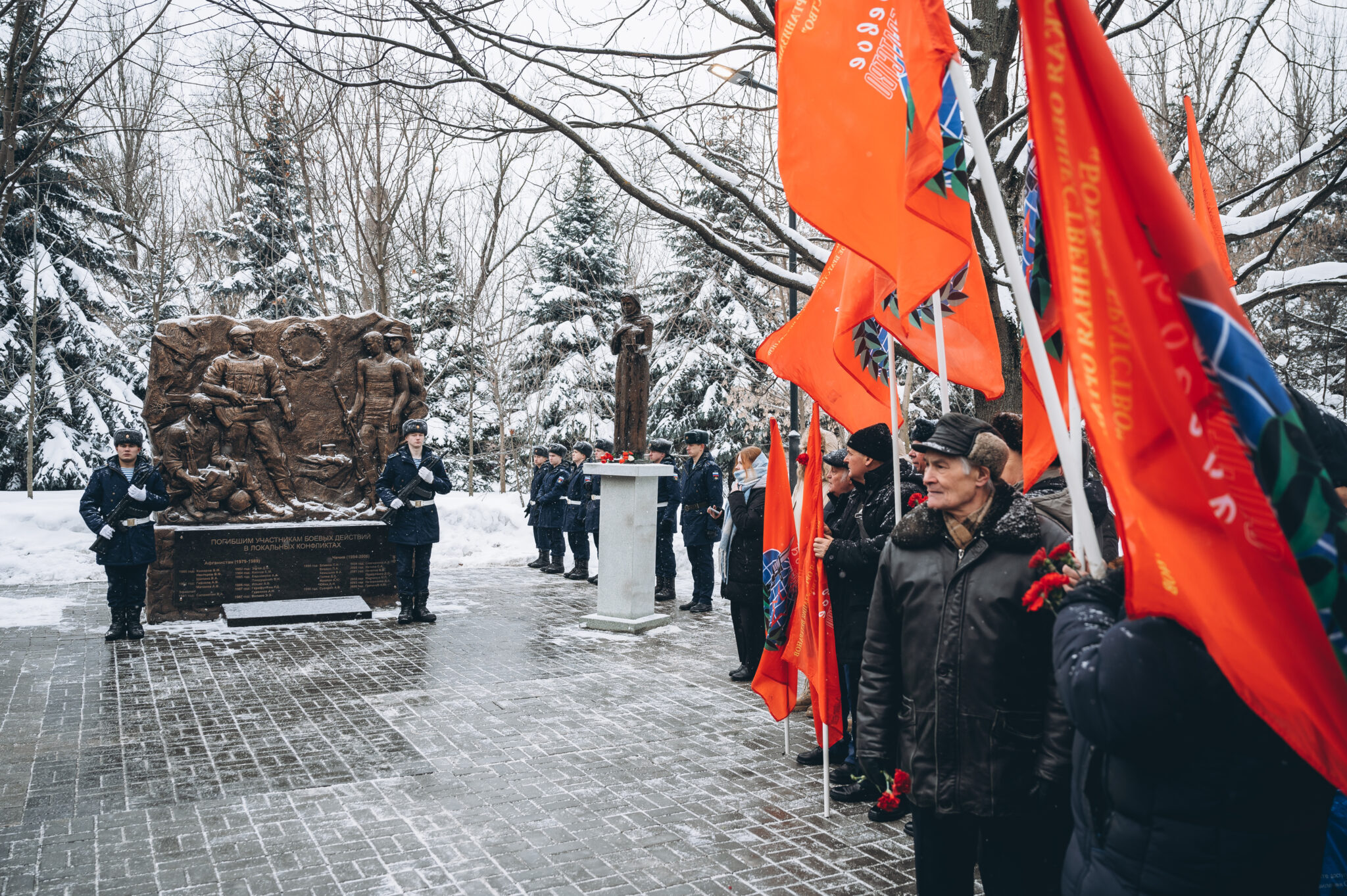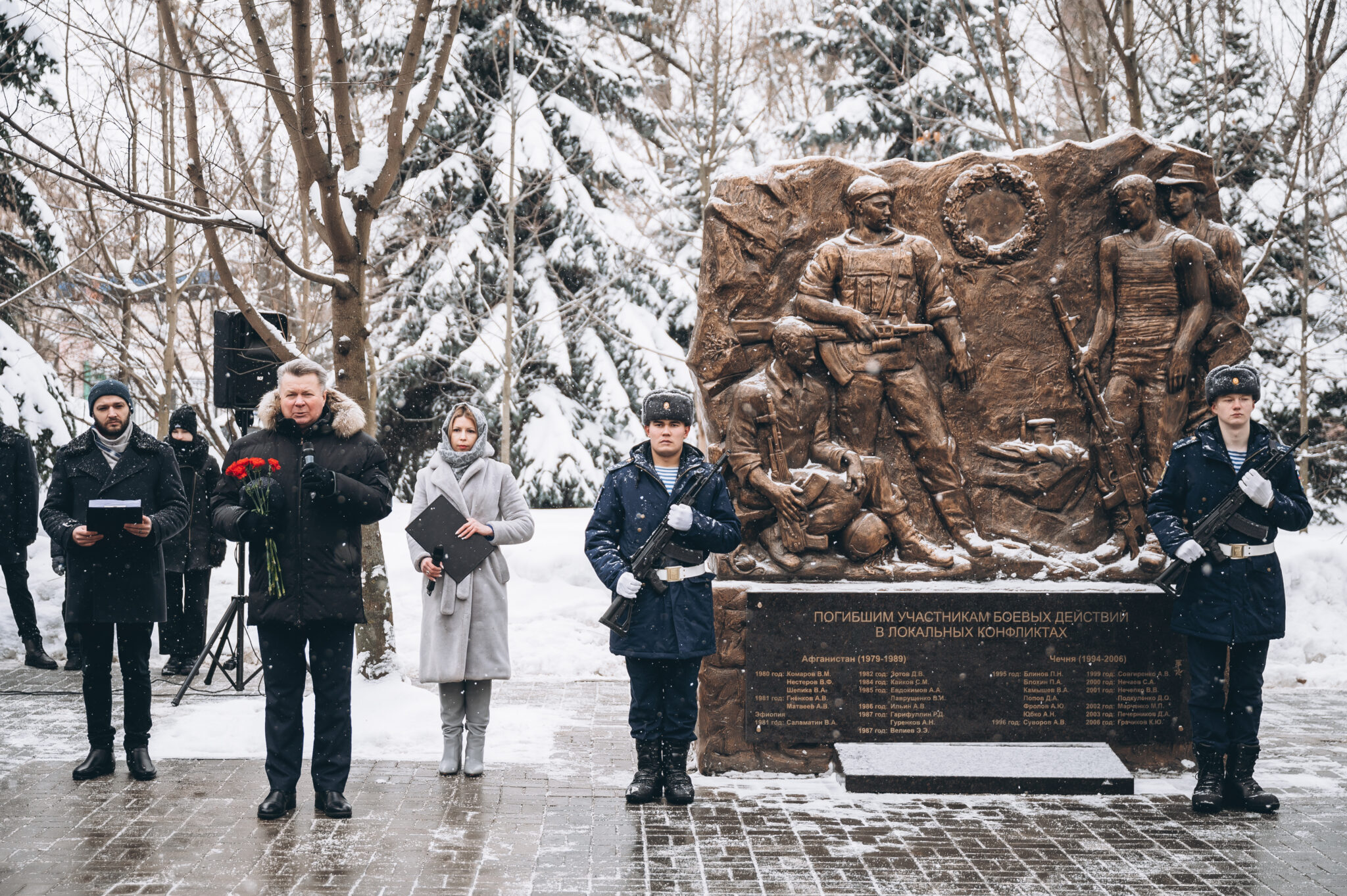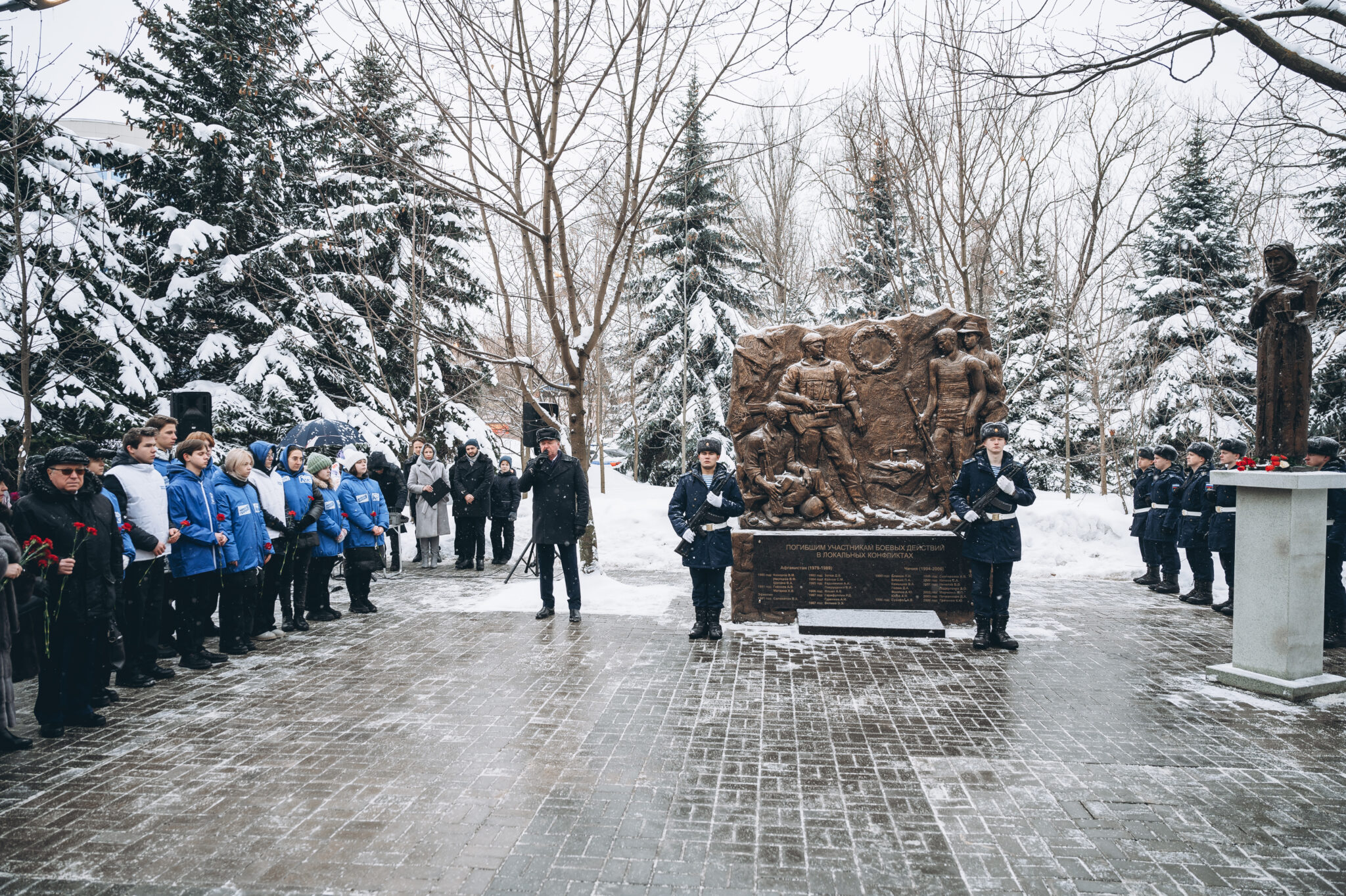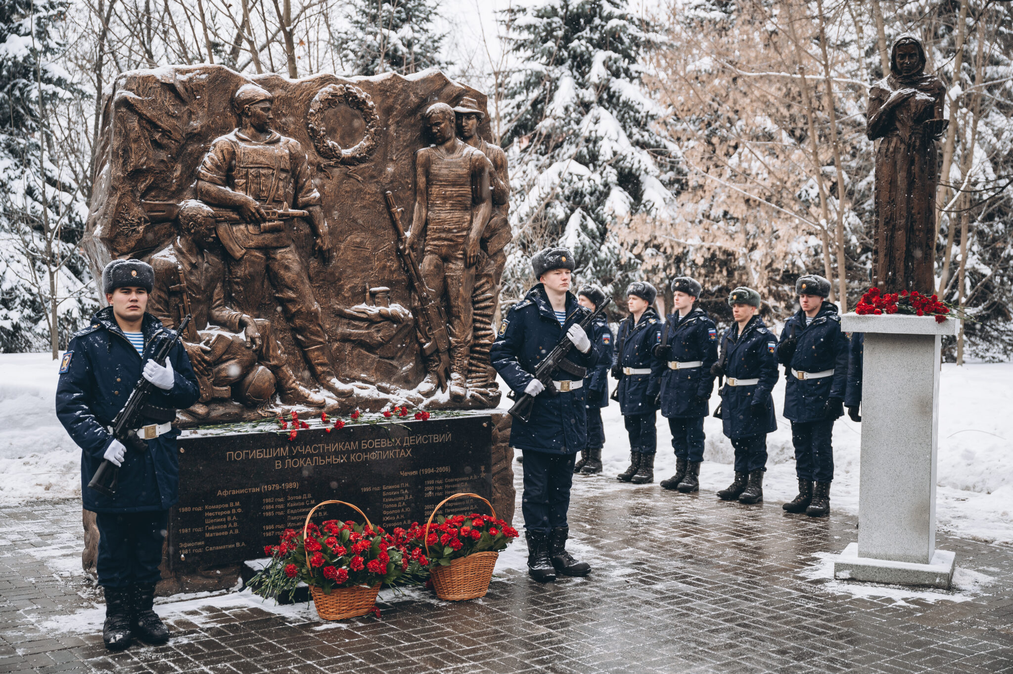 28 щёлковских ребят не вернулись с той войны, не сказали: «Мама, я живой». К их именам на гранитной плите памятника «Погибшим участникам боевых действий в локальных конфликтах» возложили цветы. В этом году красные гвоздики легли и к подножию памятника «Скорбящая мать», который установили в сквере рядом с мемориалом.
