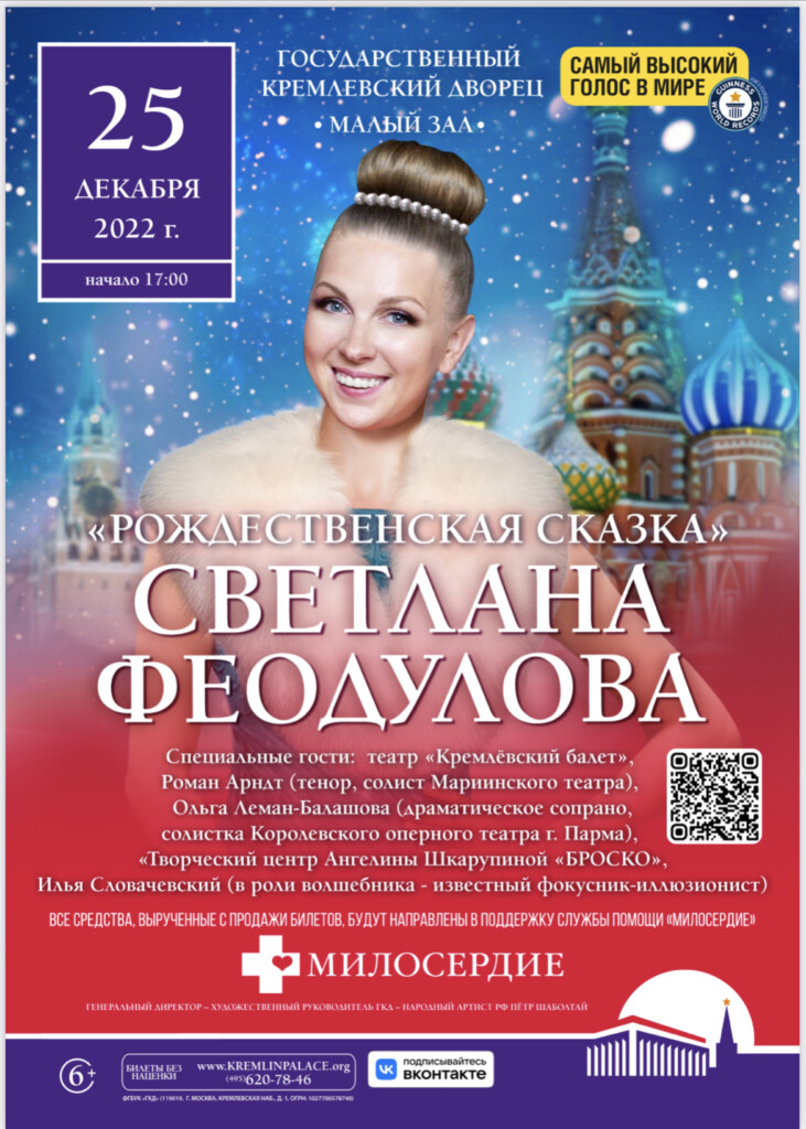 25 декабря 2022 г. в 17:00 в Государственном Кремлевском дворце состоится благотворительная акция-концерт оперной певицы Светланы Феодуловой «Рождественская сказка».