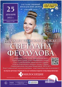 25 декабря 2022 г. в 17:00 в Государственном Кремлевском дворце состоится благотворительная акция-концерт оперной певицы Светланы Феодуловой «Рождественская сказка».