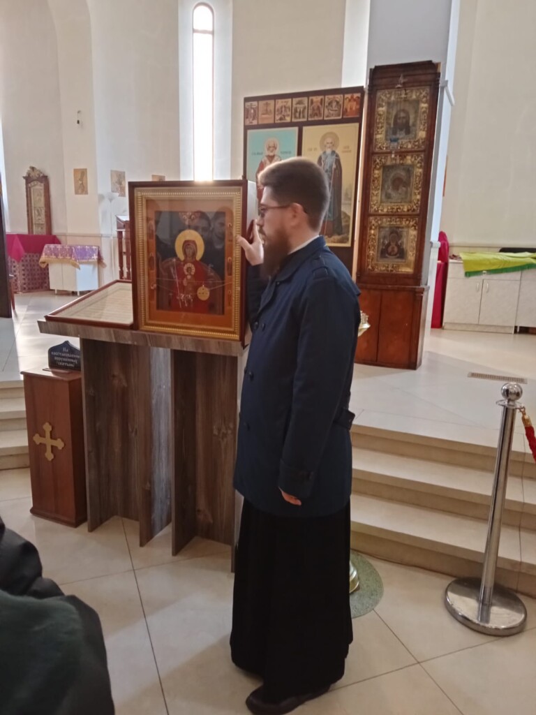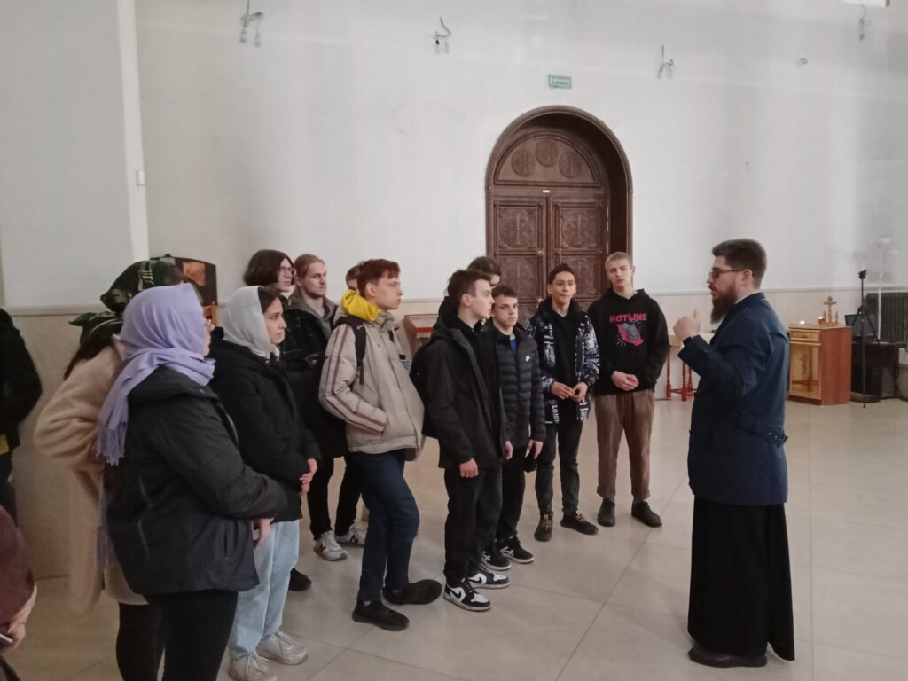 Настоятель священник Димитрий Третьяков, встретил ребят на улице и начал экскурсию со знакомства и рассказа о внешнем облике храм и его символике. Далее проследовали внутрь храма. Отец Димитрий рассказал об архитектуре храма, о внутреннем убранстве, о значении церковной свечи, объяснил, чем икона отличается от картины, рассказал о фресках, которыми украшены стены храма, ответил на многочисленные вопросы.