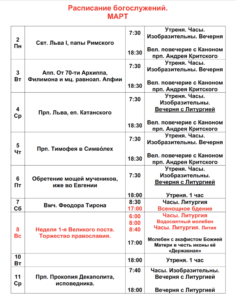Обновлён раздел «Расписание богослужений» ГлавнаяНовости / Обновлён раздел «Расписание богослужений» Расписание богослужений на март