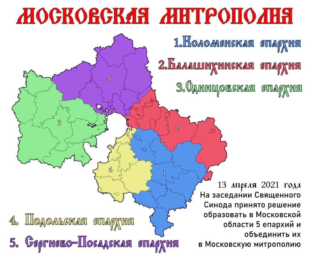 13 апреля 2021 г. Священный Синод Русской Православной Церкви принял решение об образовании в Московской области пяти епархий и объединении их в Московскую митрополию.