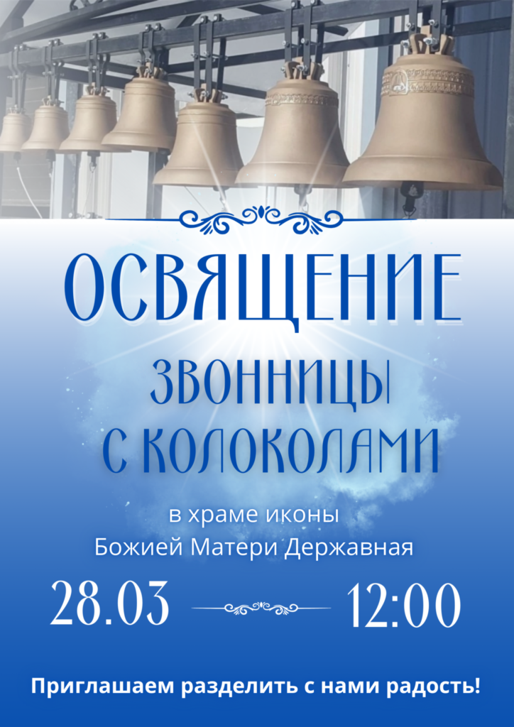 Освящение звонницы с колоколами ГлавнаяНовости / Освящение звонницы с колоколами Дорогие братья и сестры! Завтра 28.03 (пятница) в 12:00 освящение звонницы с колоколами в храме иконы Божией Матери Державная г.Фрязино на ул.Нахимова 27А. Приглашаем всех кто сможет присоединиться к молитве и разделить радость!