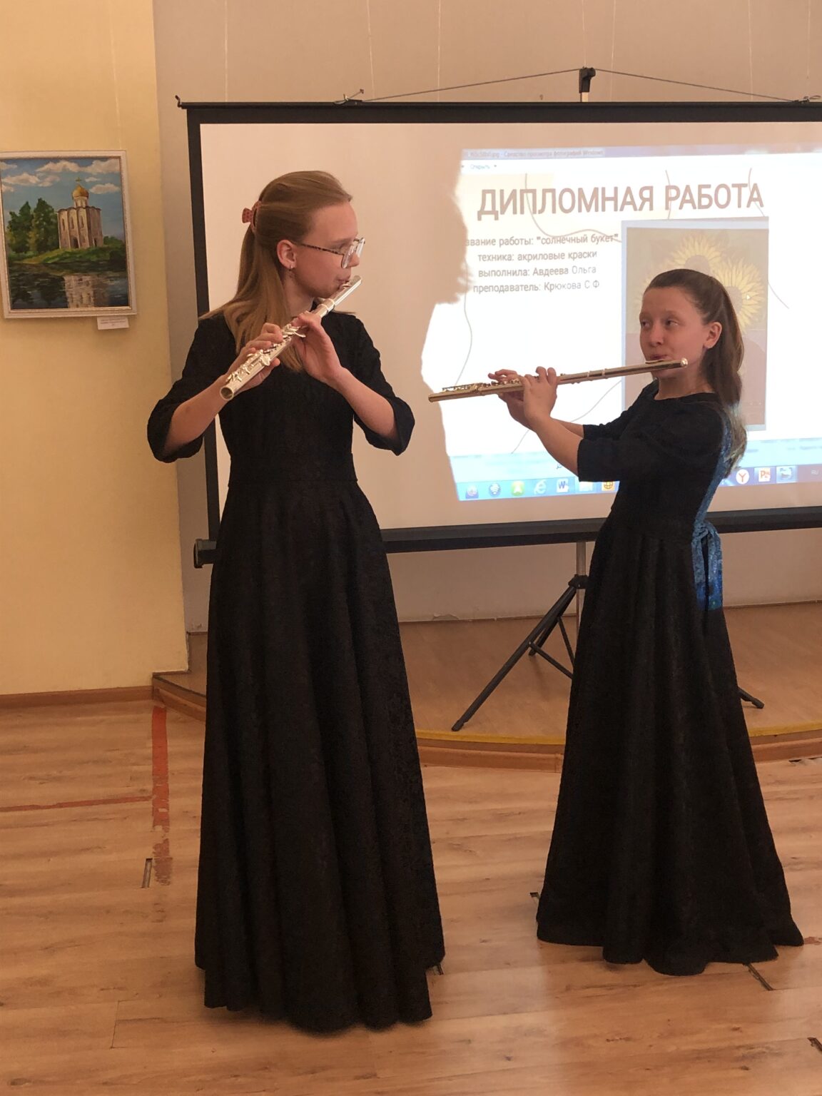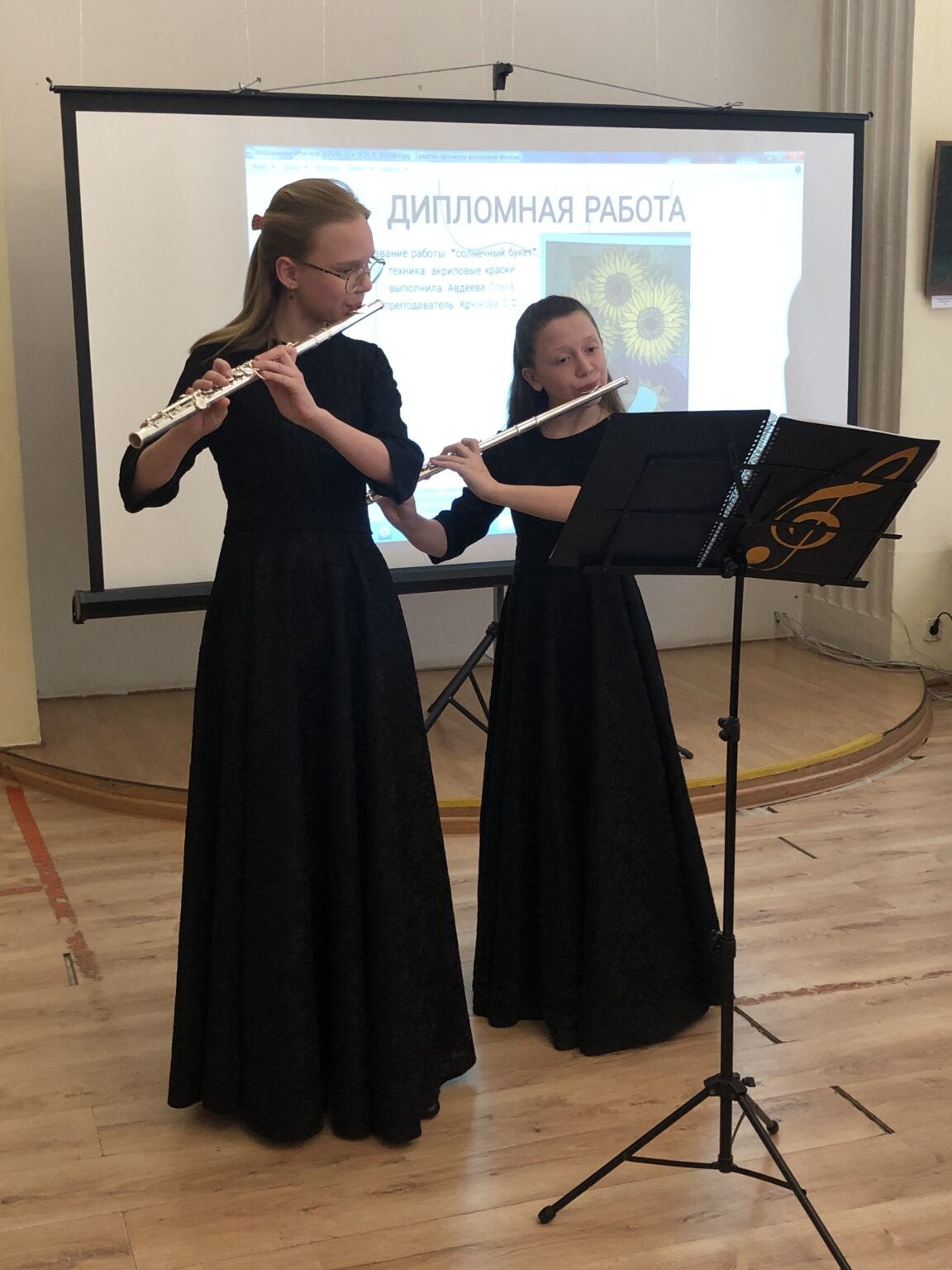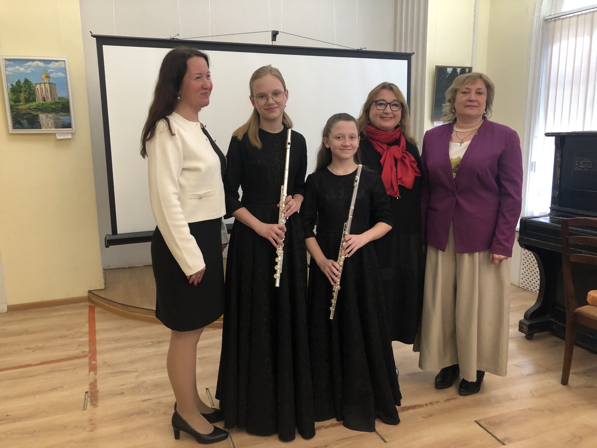 Праздничное настроение создали юные музыканты ФДШИ по классу флейты — преподаватель А.В.Попова, концертмейстер Т.В.Обрезан.