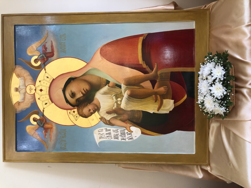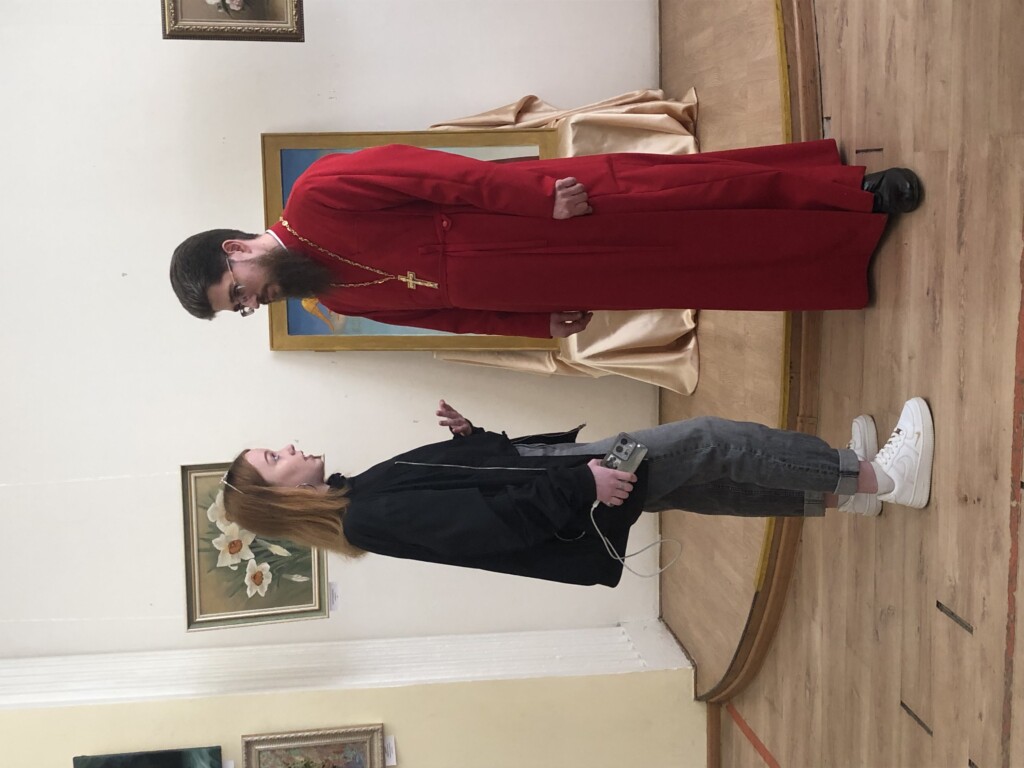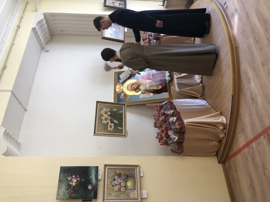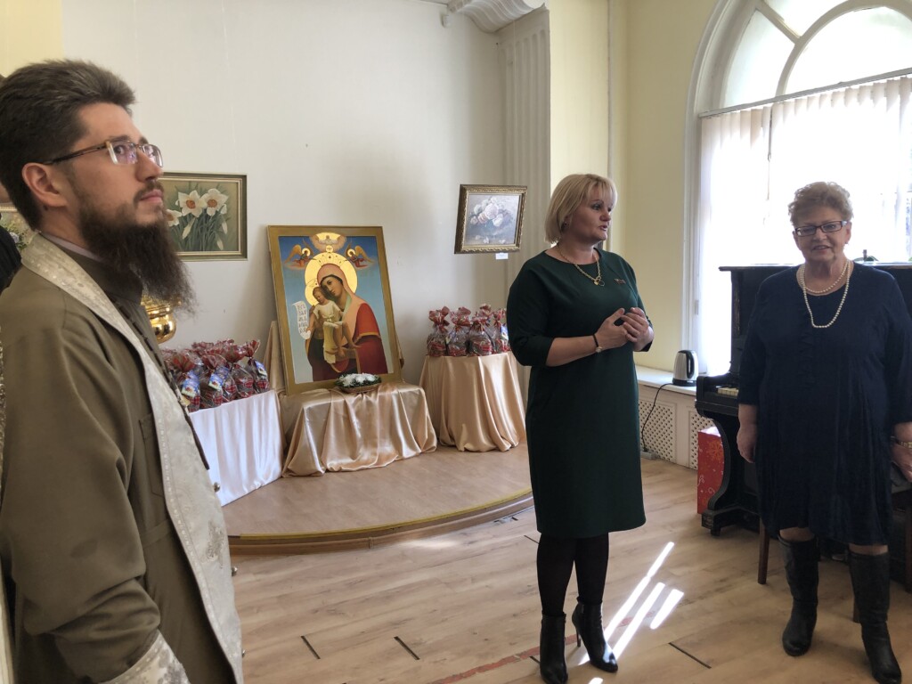 Настоятель Державного храма г. Фрязино священник Димитрий Третьяков обратился с приветственным словом и совершил чин освящения иконы Божьей Матери «Достойно есть», которую написал фрязинский художник Евгений Богатов.