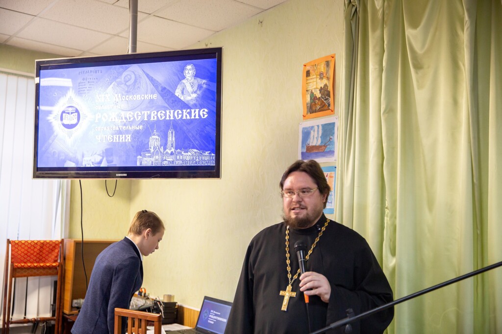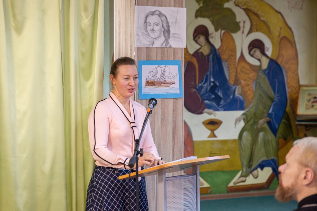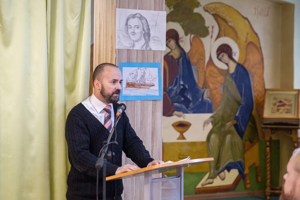 Учитель истории, обществознания и Духовного краеведения Подмосковья школы № 16 г. Щелково Тимофей Александрович Балыко выступил с докладом «Петр I и Церковь», в котором показал отношение государя к Церкви и обозначил события, повлиявшие на решение Петра I больше не избирать патриарха для Русской Церкви.