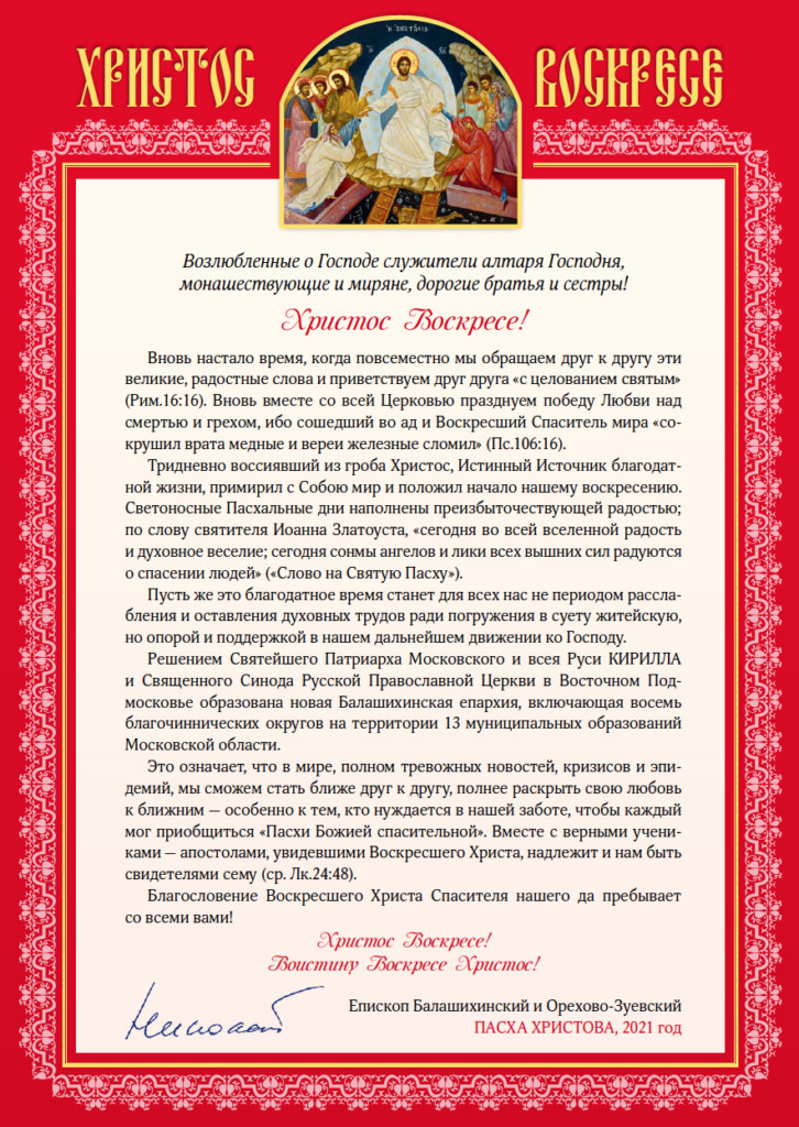 Пасхальное послание епископа Балашихинского и Орехово-Зуевского, Николая