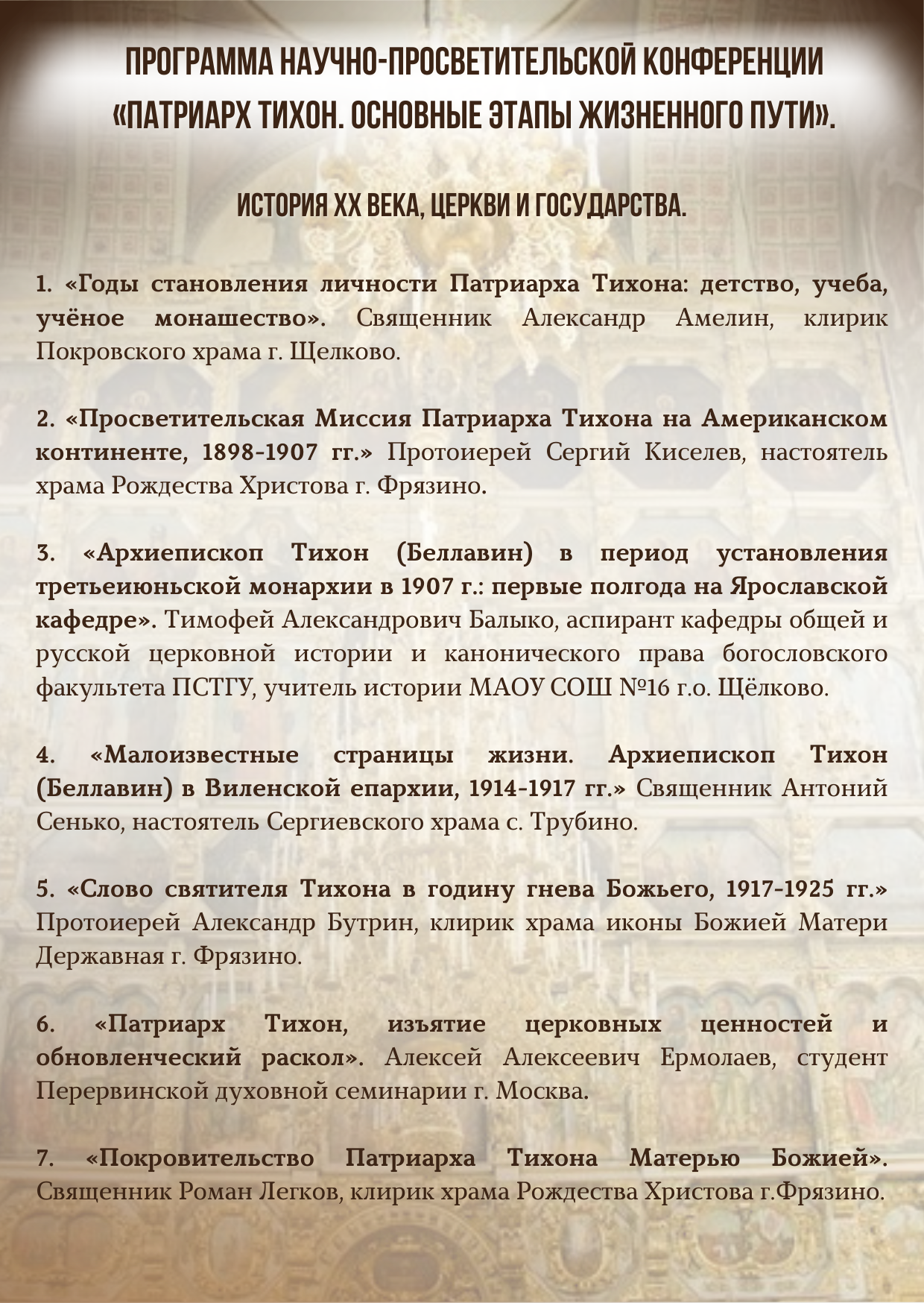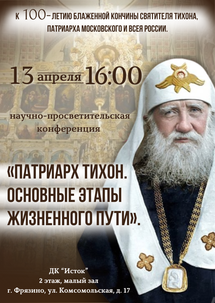 Приглашаем на научно-просветительскую конференцию «Патриарх Тихон. Основные этапы жизненного пути» ГлавнаяНовости / Приглашаем на научно-просветительскую конференцию «Патриарх Тихон. Основные этапы жизненного пути» 3 апреля 2025 г. 16:00 ДК «Исток», г. Фрязино, ул. Комсомольская, 17, малый зал 2 этаж.