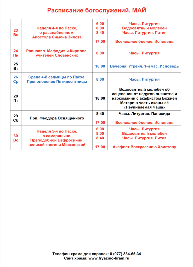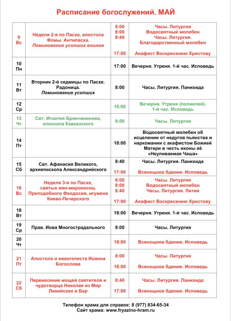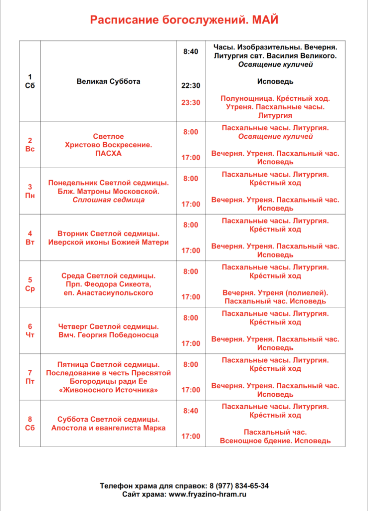 Расписание богослужений на май.