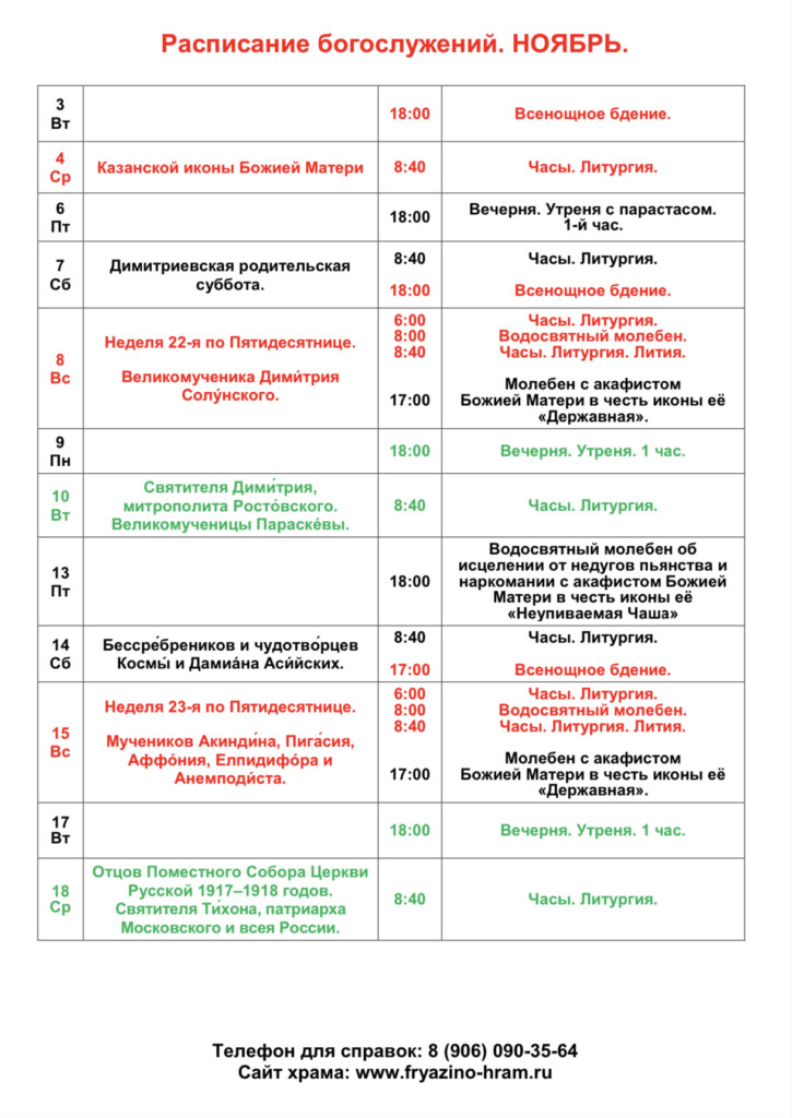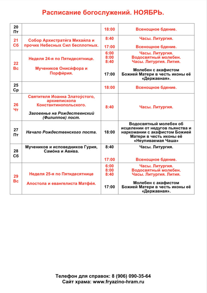 Расписание богослужений на ноябрь