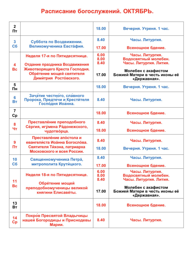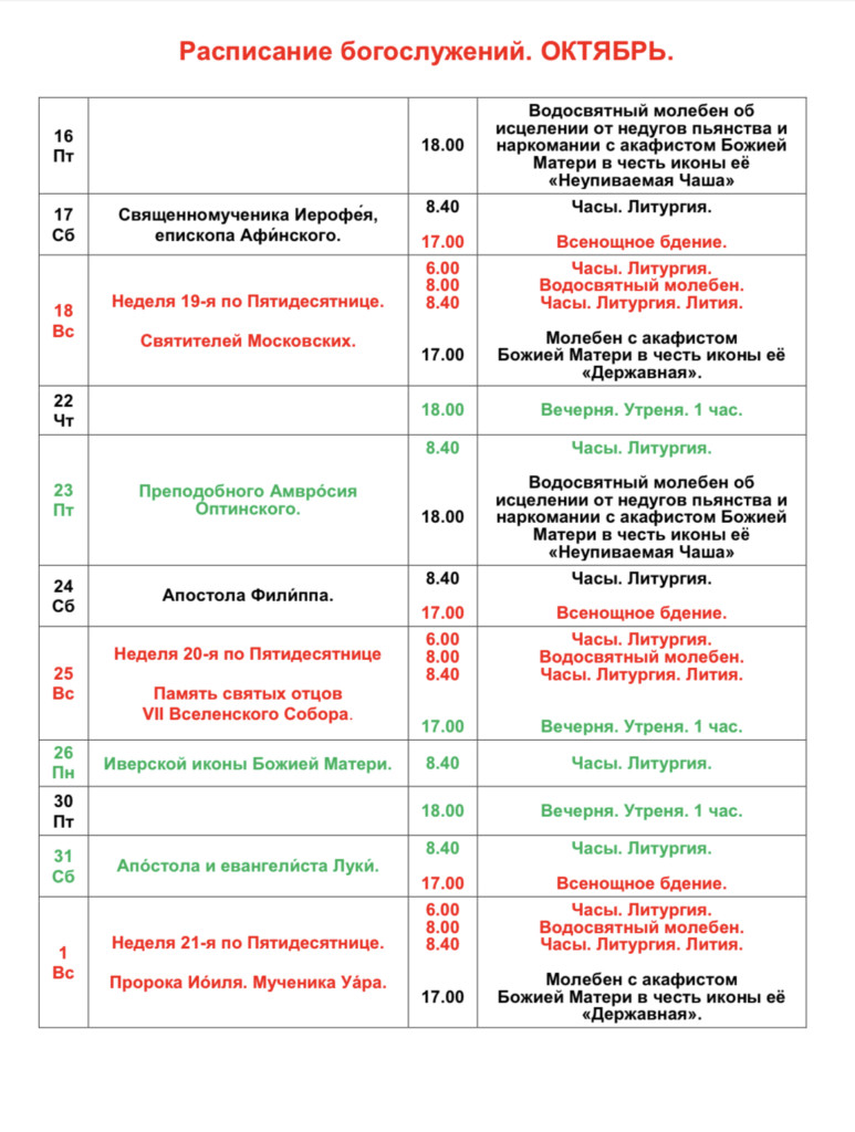 Расписание богослужений в октябре. ГлавнаяНовости / Расписание богослужений в октябре. Обновление в разделе «Расписание богослужений»