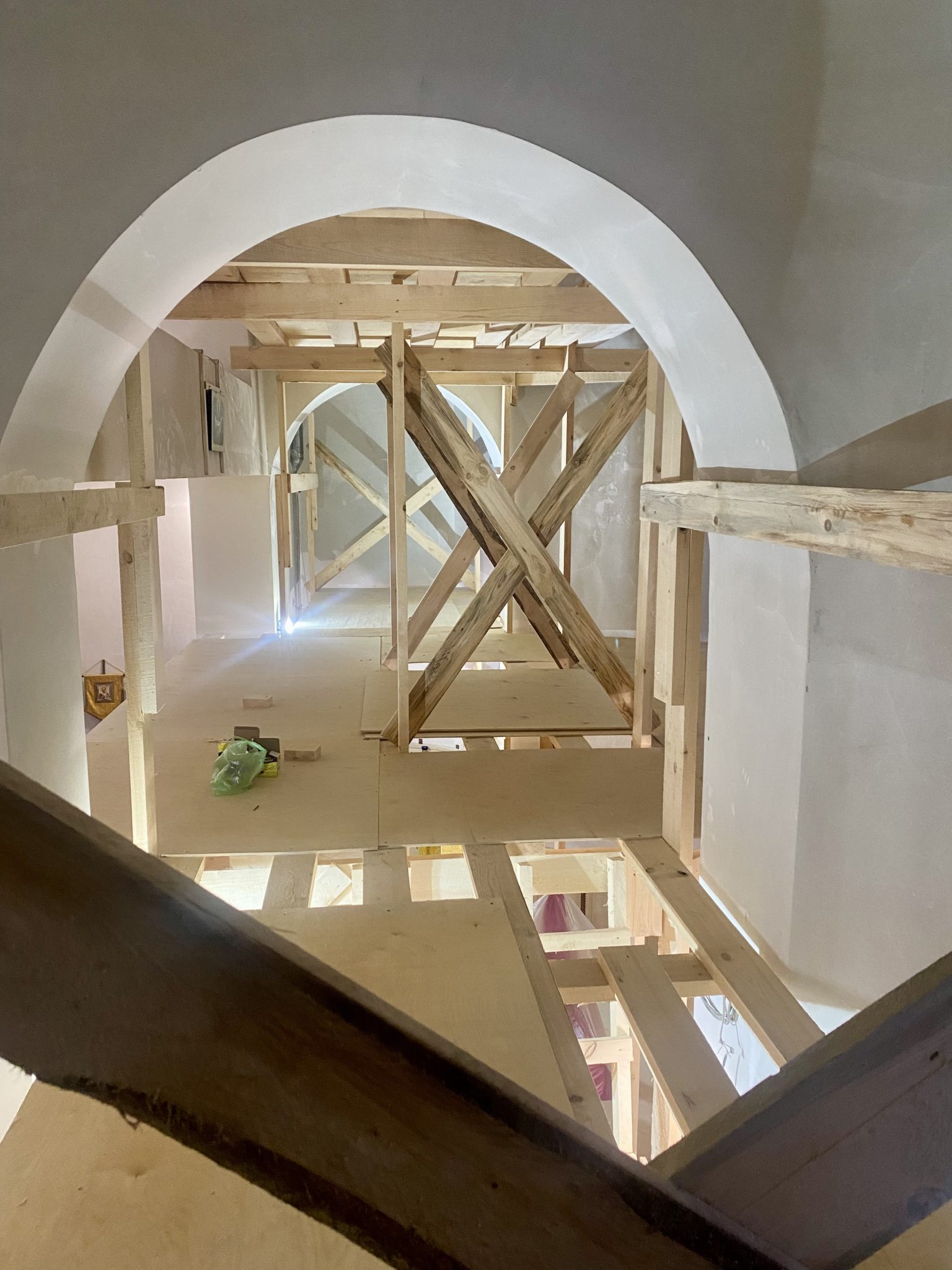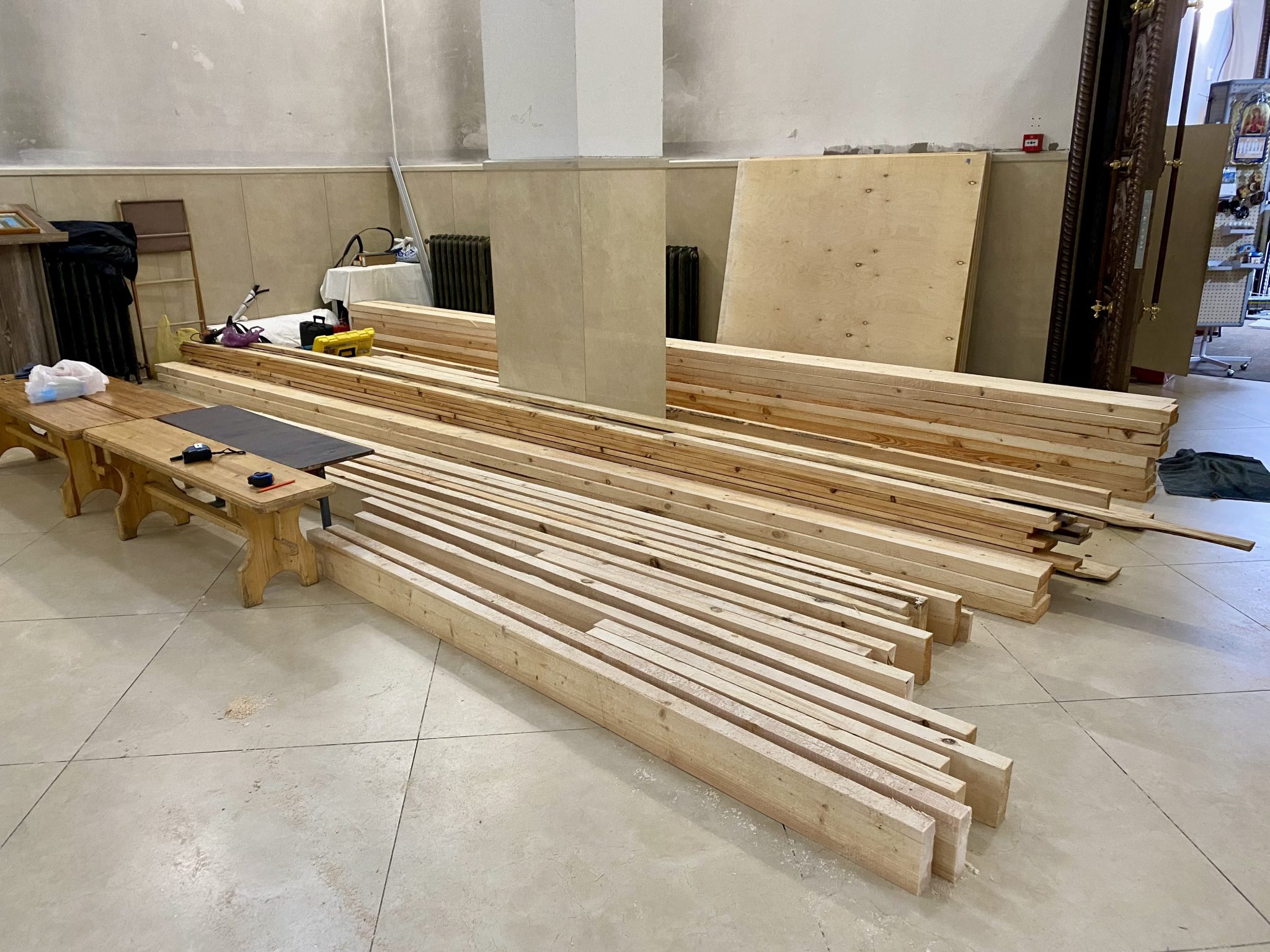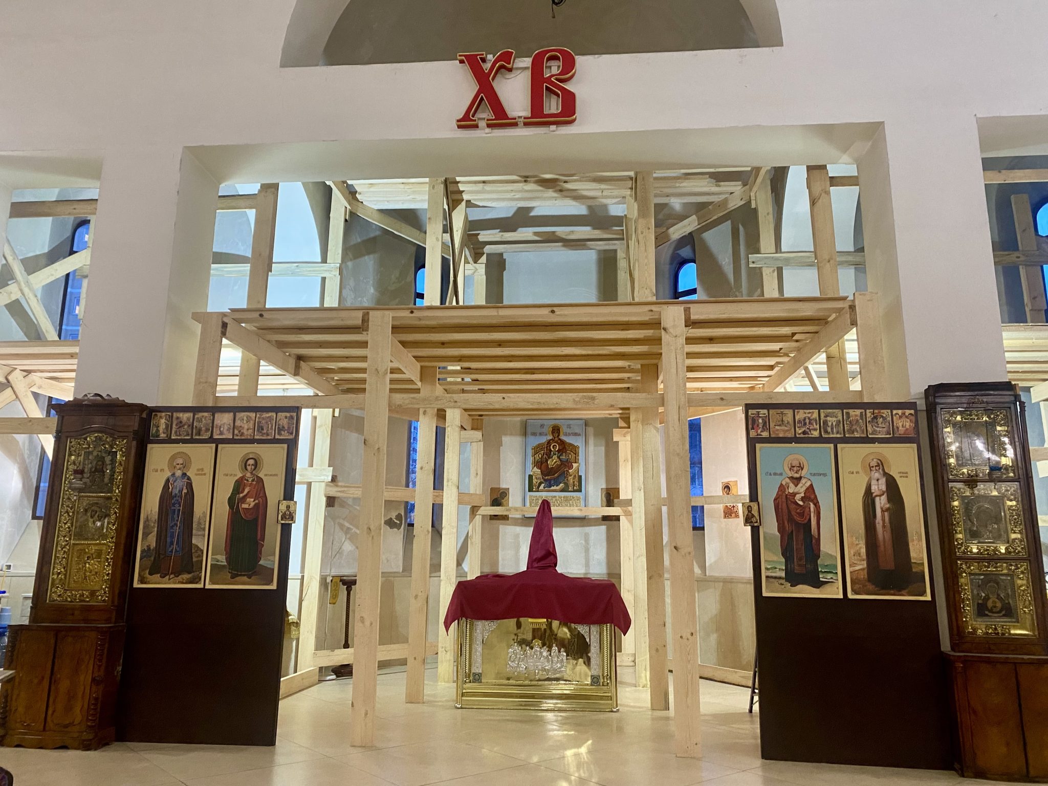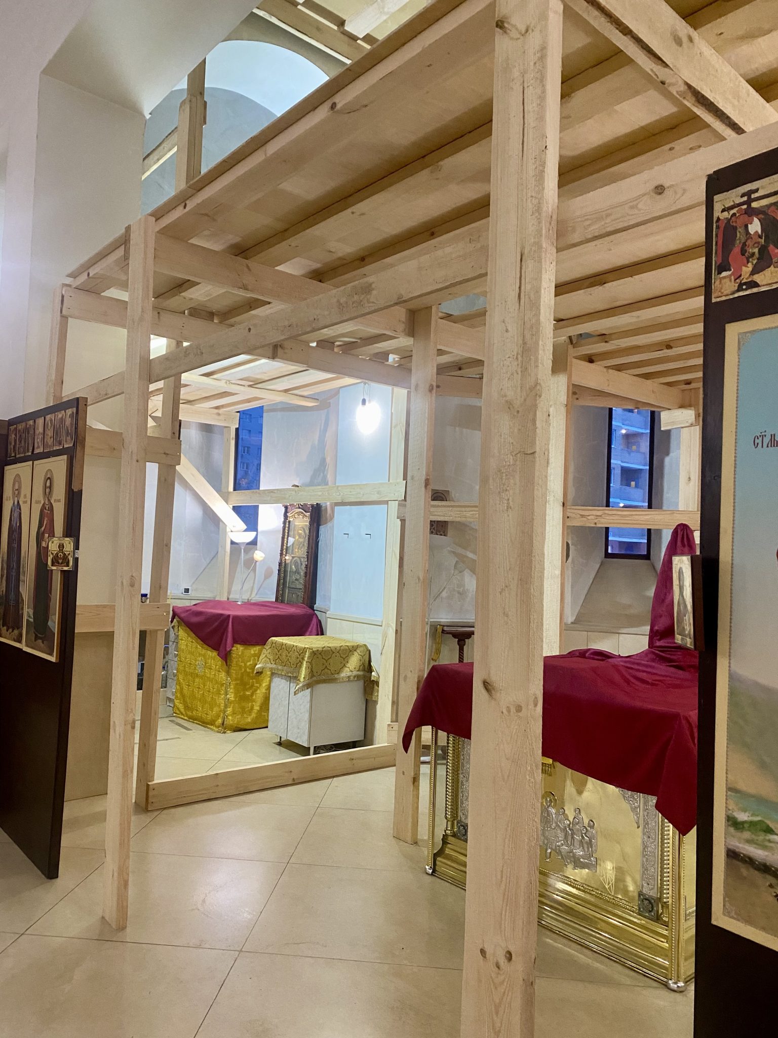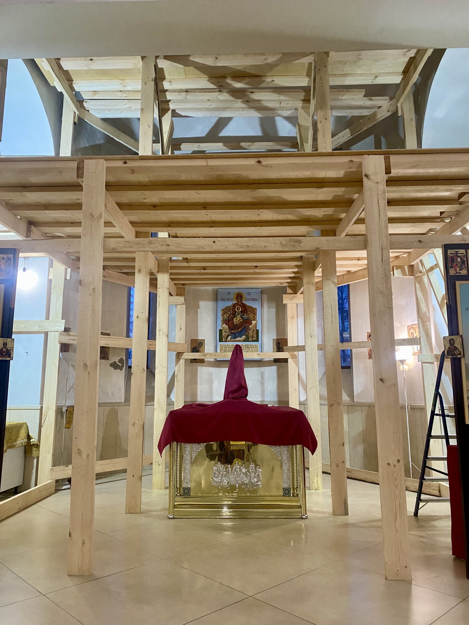 В настоящее время в алтаре продолжается монтаж строительных лесов.