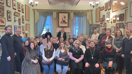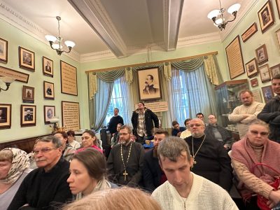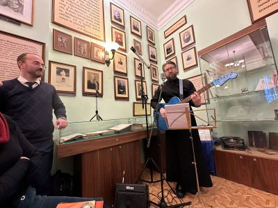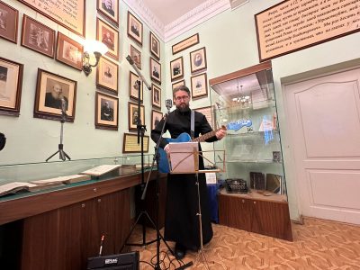 Приветственным словом открыл встречу, организованную Щёлковским благочинием при участии щёлковских методических объединений учителей духовных дисциплин и учителей истории, руководитель гостиной имени А.В.Жиркевича, настоятель Сергиевского храма с.Трубино, священник Антоний Сенько. Музыкальное вступление представил православный бард, миссионер, старший пономарь Троицкого собора г.Щёлково, член союза писателей России, мультиинструменталист, волонтёр СВО Валерий Полянкин, исполнивший свои известные композиции «Старый храм», «Святые юристы» и другие.