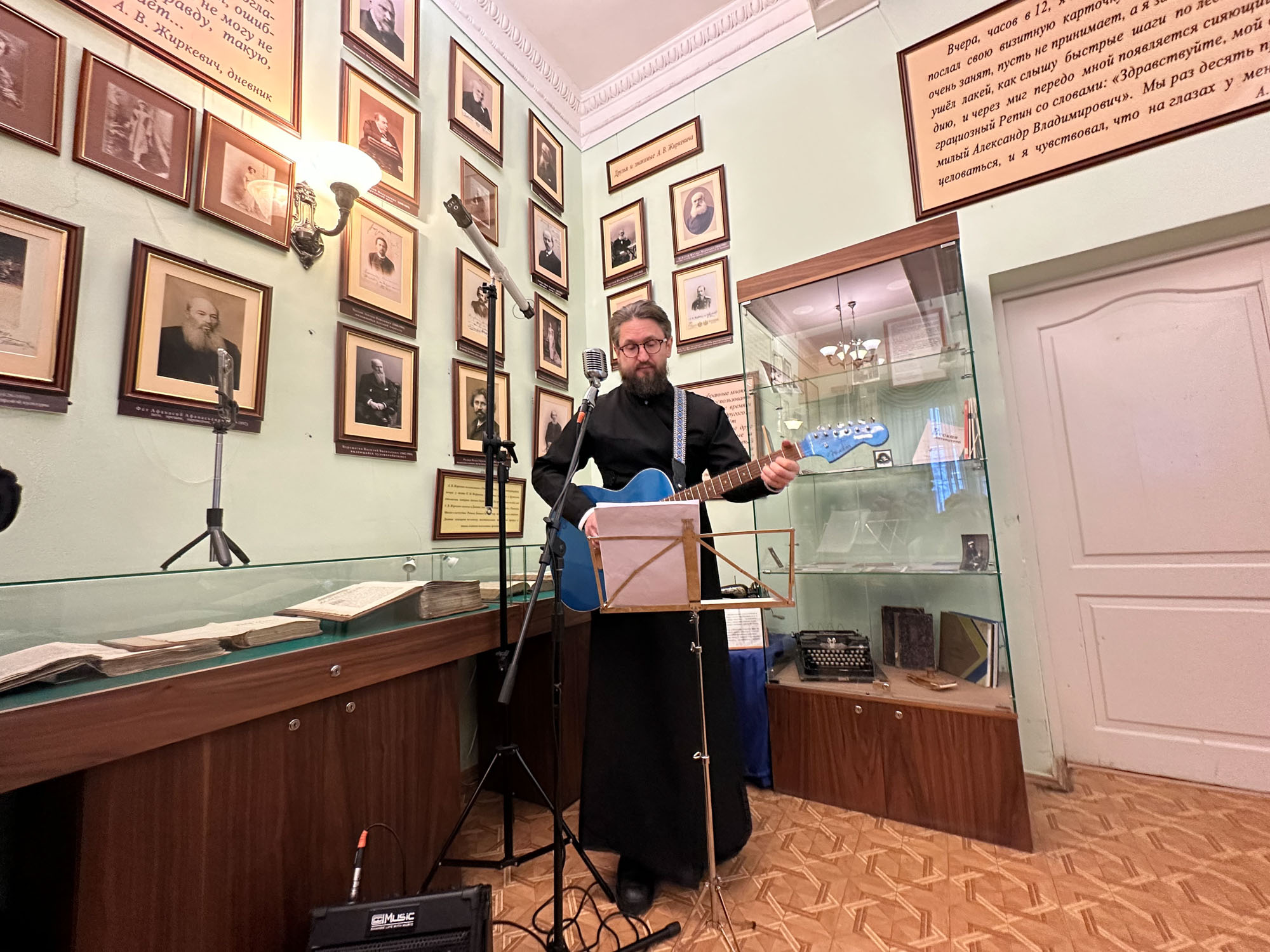 Приветственным словом открыл встречу, организованную Щёлковским благочинием при участии щёлковских методических объединений учителей духовных дисциплин и учителей истории, руководитель гостиной имени А.В.Жиркевича, настоятель Сергиевского храма с.Трубино, священник Антоний Сенько. Музыкальное вступление представил православный бард, миссионер, старший пономарь Троицкого собора г.Щёлково, член союза писателей России, мультиинструменталист, волонтёр СВО Валерий Полянкин, исполнивший свои известные композиции «Старый храм», «Святые юристы» и другие.