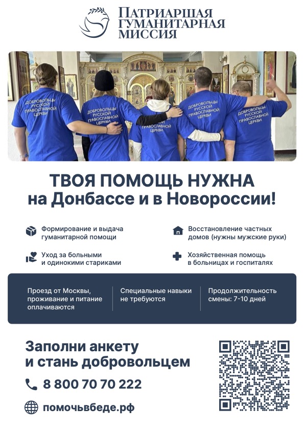 Патриаршая гуманитарная миссия постоянно расширяет географию работы – сегодня центры помощи миссии действуют в Мариуполе, Северодонецке, Донецке, Скадовске, Лисичанске и других городах. Дорога туда-обратно из Москвы, проживание и питание добровольцев оплачиваются.
