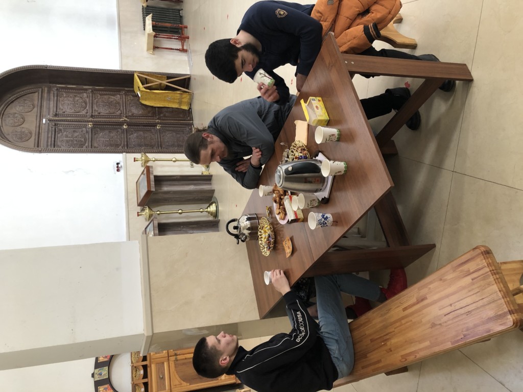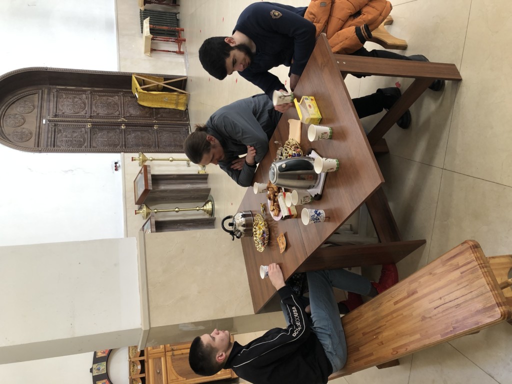 По окончании выполненных работ ребята за кружкой чая пообщались с клириком храма священником Владимиром Тарасюком.