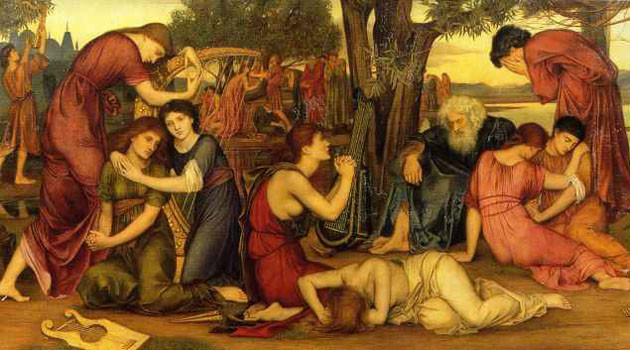 «У рек Вавилонских там мы сели и заплакали, когда вспомнилось нам о Сионе. На ивах посреди него повесили мы орга́ны наши, ибо там спросили нас пленившие нас о словах песен и уведшие нас – о пении: „Пропойте нам из песен Сионских“. Как споем мы песнь Господню на земле чужой? Если забуду тебя, Иерусалим, пусть забыта будет десница моя! Пусть прилипнет язык мой к гортани моей, если не вспомню тебя, если не поставлю Иерусалима в самом начале веселья моего. Вспомни, Господи, сынов Эдо́ма в день Иерусалима, говорящих: „Разоряйте, разоряйте до оснований его“. Дочь Вавилона злосчастная, блаже́н, кто воздаст тебе возмездие твое, которым ты воздала ́ нам; блаже́н, кто схватит и разобьет младенцев твоих о камень».