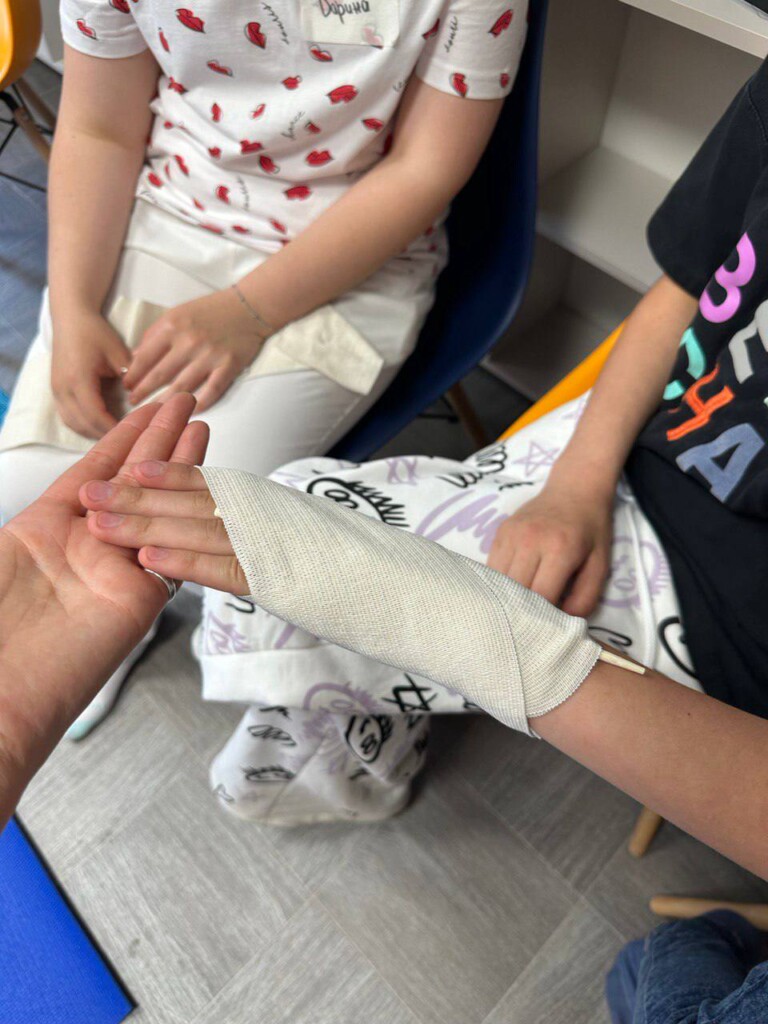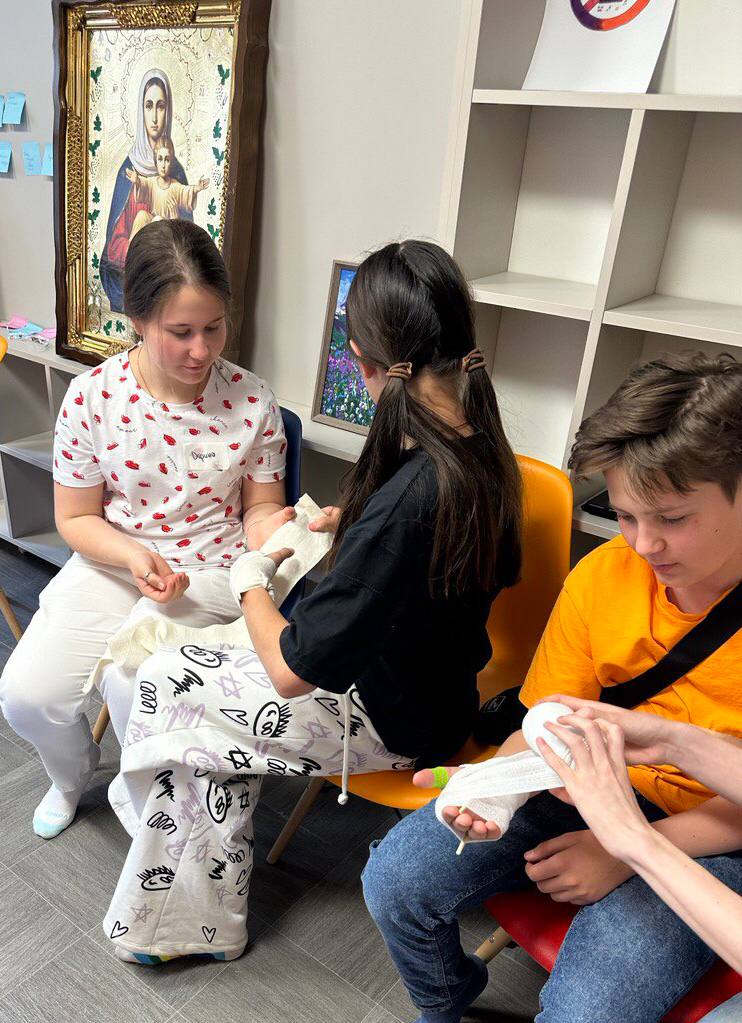 Основную часть времени составила практика: дети накладывали повязки, жгуты, учились что делать при ожогах и как правильно вызывать скорую.