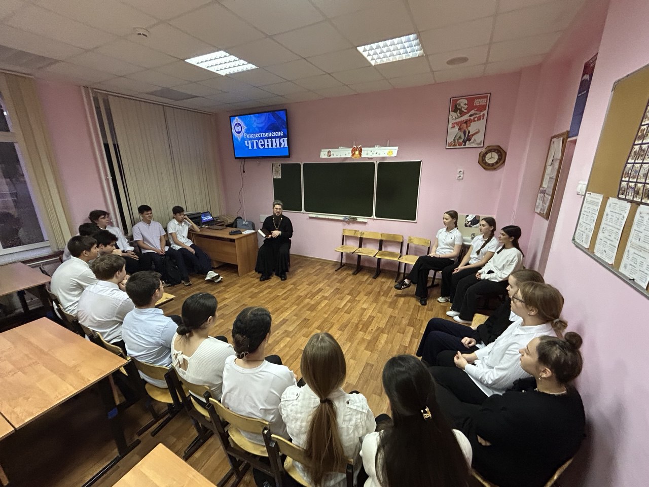14 ноября 2025 года в школе №3 имени Героя Советского Союза А.Г.Дудкина г.Фрязино прошла встреча в рамках Международных Рождественских образовательных чтений учеников 9 «Б» класса с настоятелем храма иконы Божией Матери Державная г.Фрязино священником Димитрием Третьяковым.