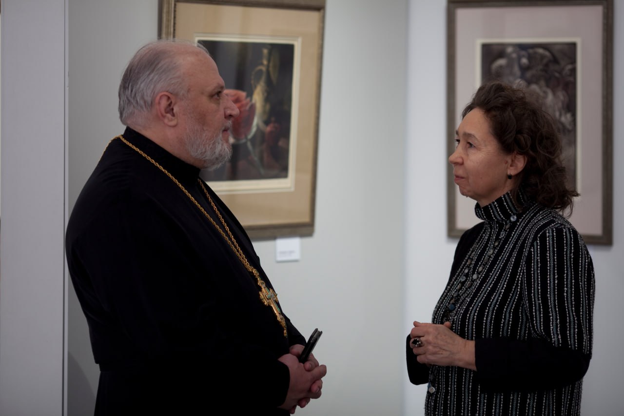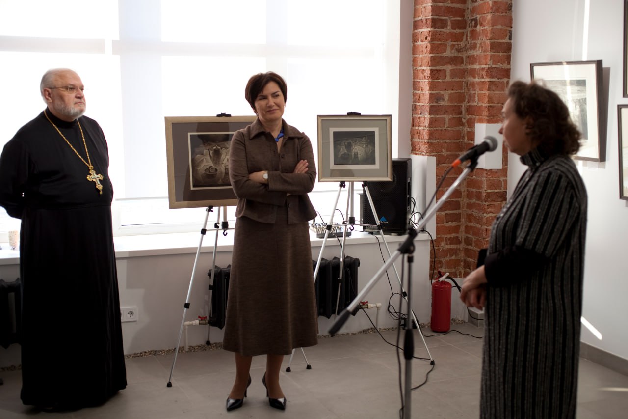 На открытие выставки собрались любители высокого искусства и молодёжь – учащиеся Щёлковского колледжа. Среди приглашённых гостей был клирик храма Державной иконы Пресвятой Богородицы г. Фрязино протоиерей Александр Бутрин, которого связывает с художницей Мариной Лазаревой и её супругом многолетняя дружба.