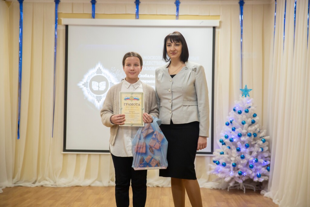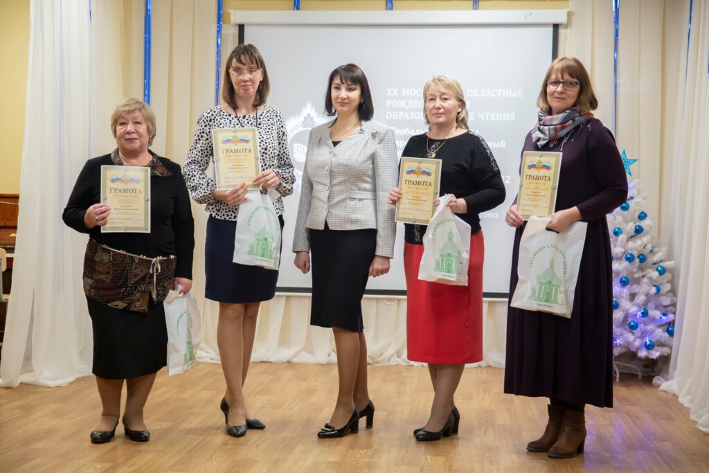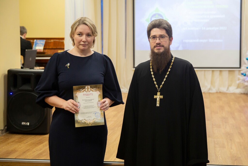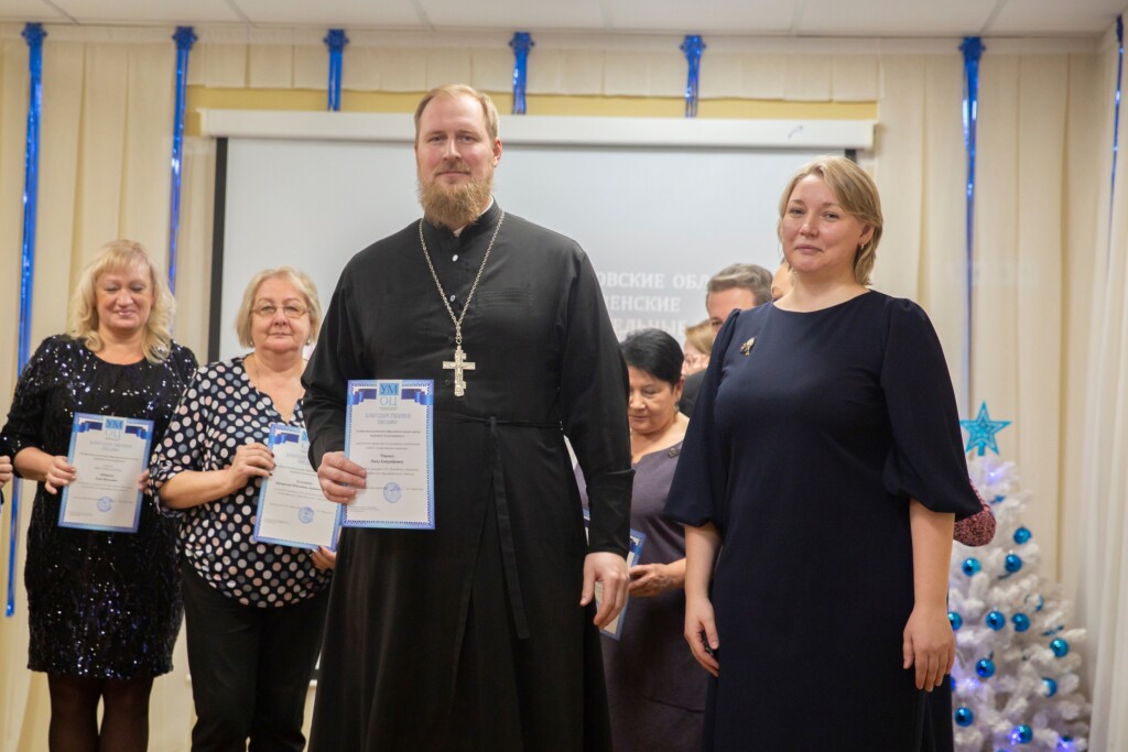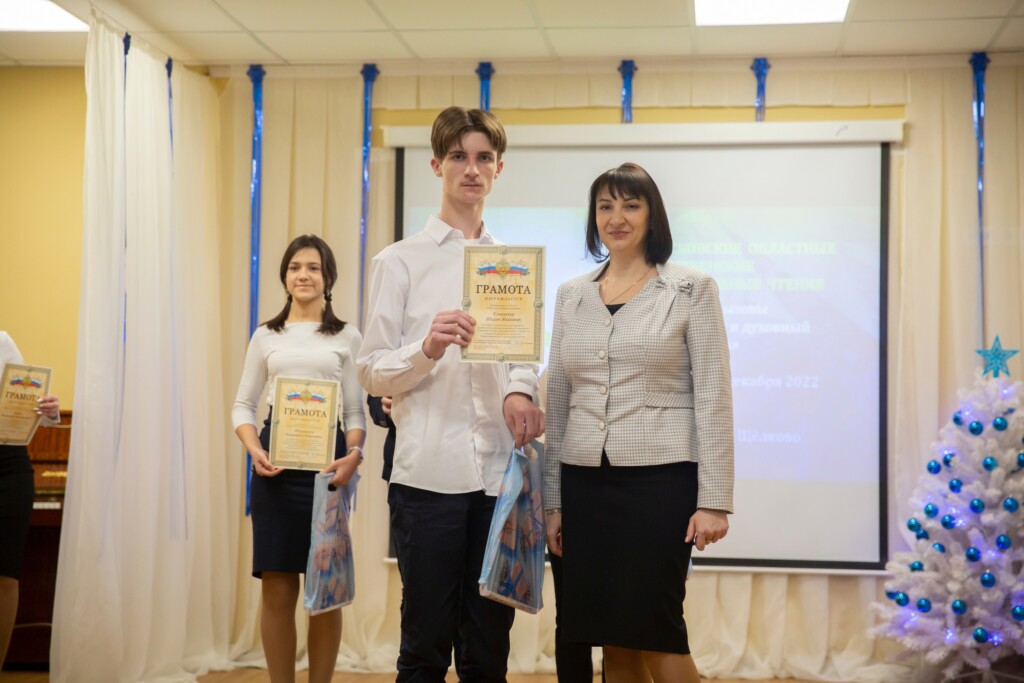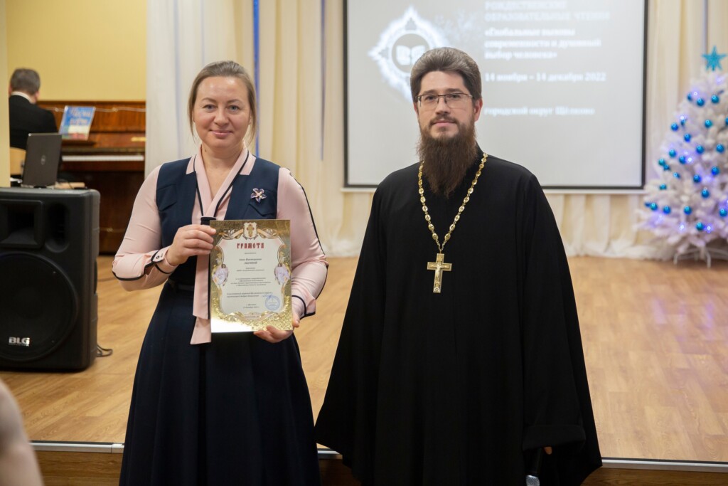 Заместитель благочинного Щёлковского церковного округа священник Димитрий Третьяков и исполняющий обязанности председателя Комитета по образованию Елена Николаевна Бушнева наградили педагогов и обучающихся, принявших активное участие в мероприятиях в рамках Рождественских чтений, Почётными грамотами и памятными подарками.